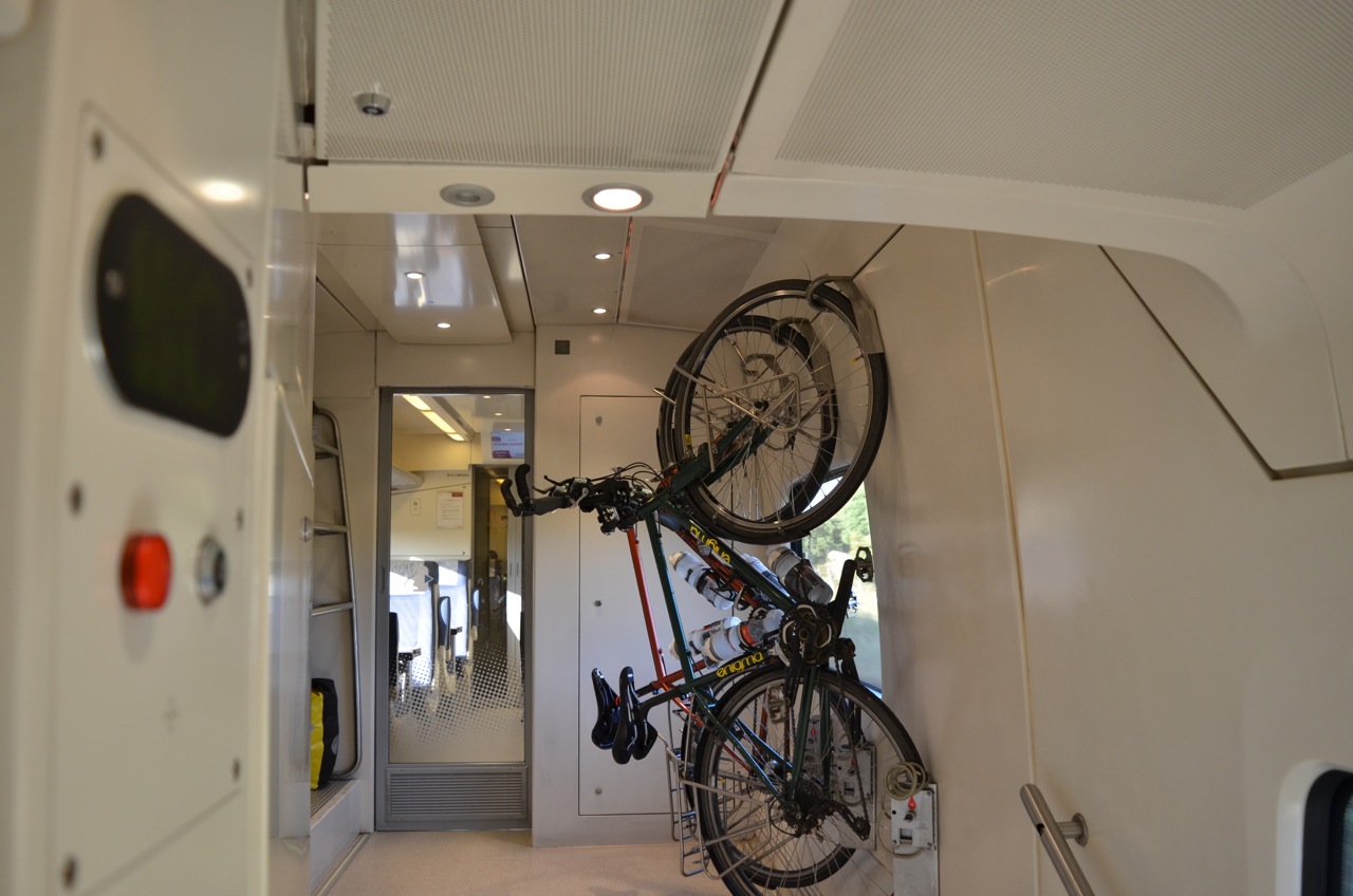 We got to the station in good time and spent a leisurely 15 minutes loading the bikes. Now I’m not a train geek, but I am starting to be a bike geek, and the bike rack on this train got me a bit excited!