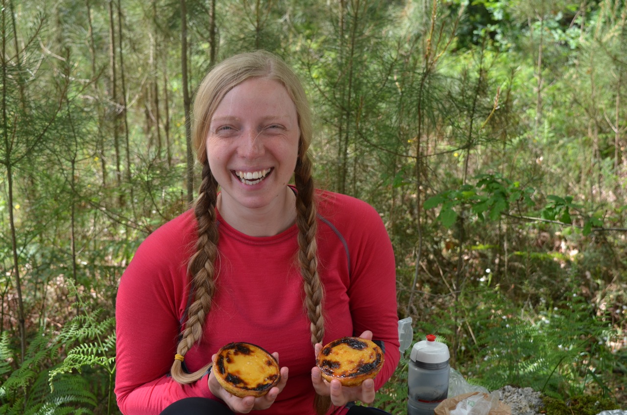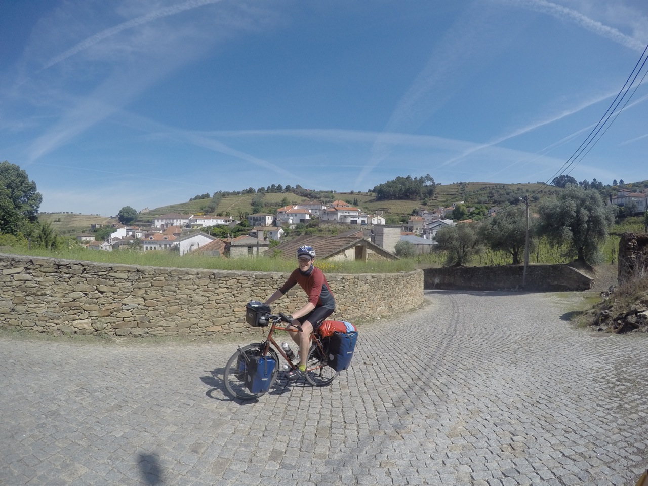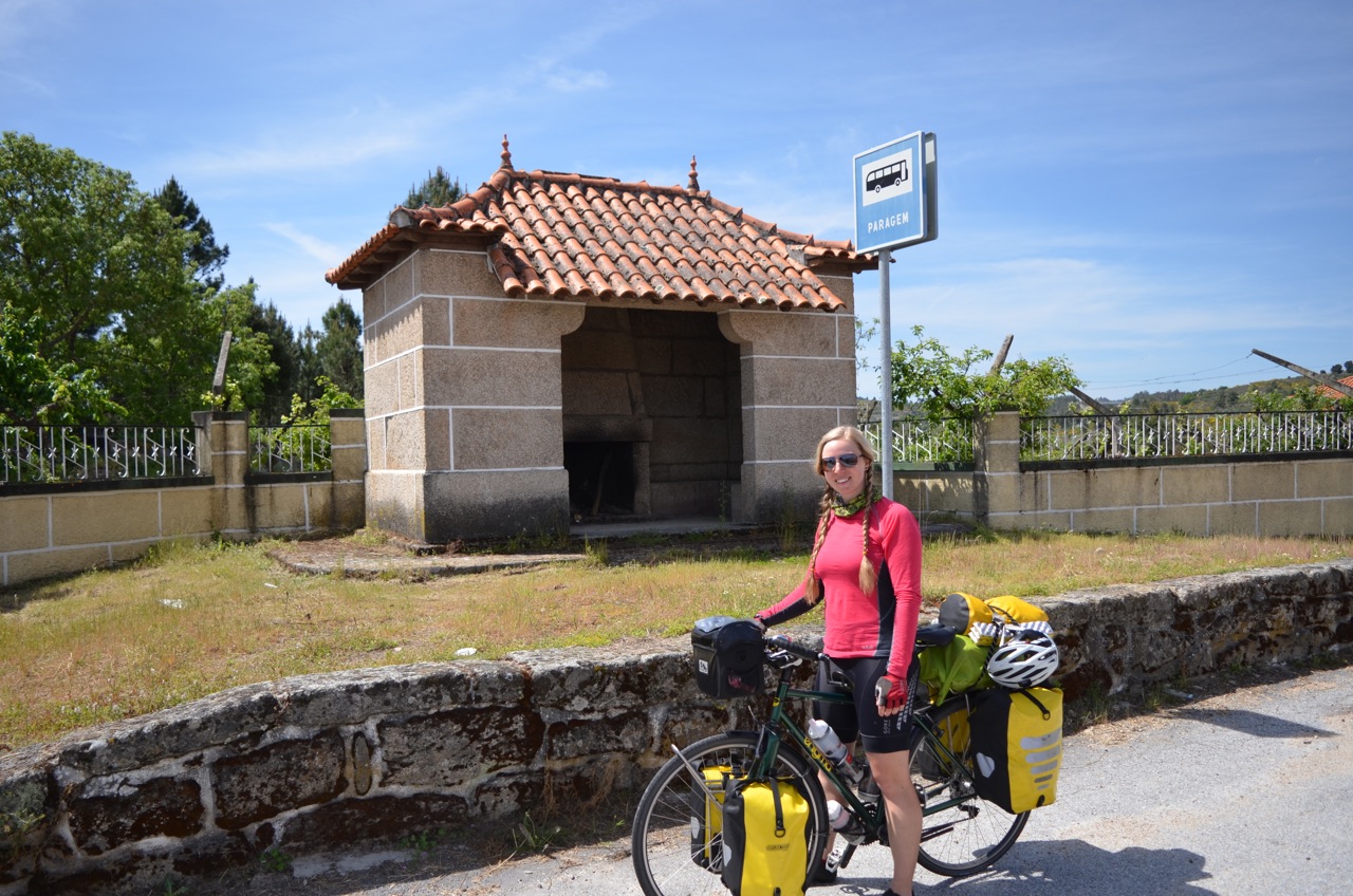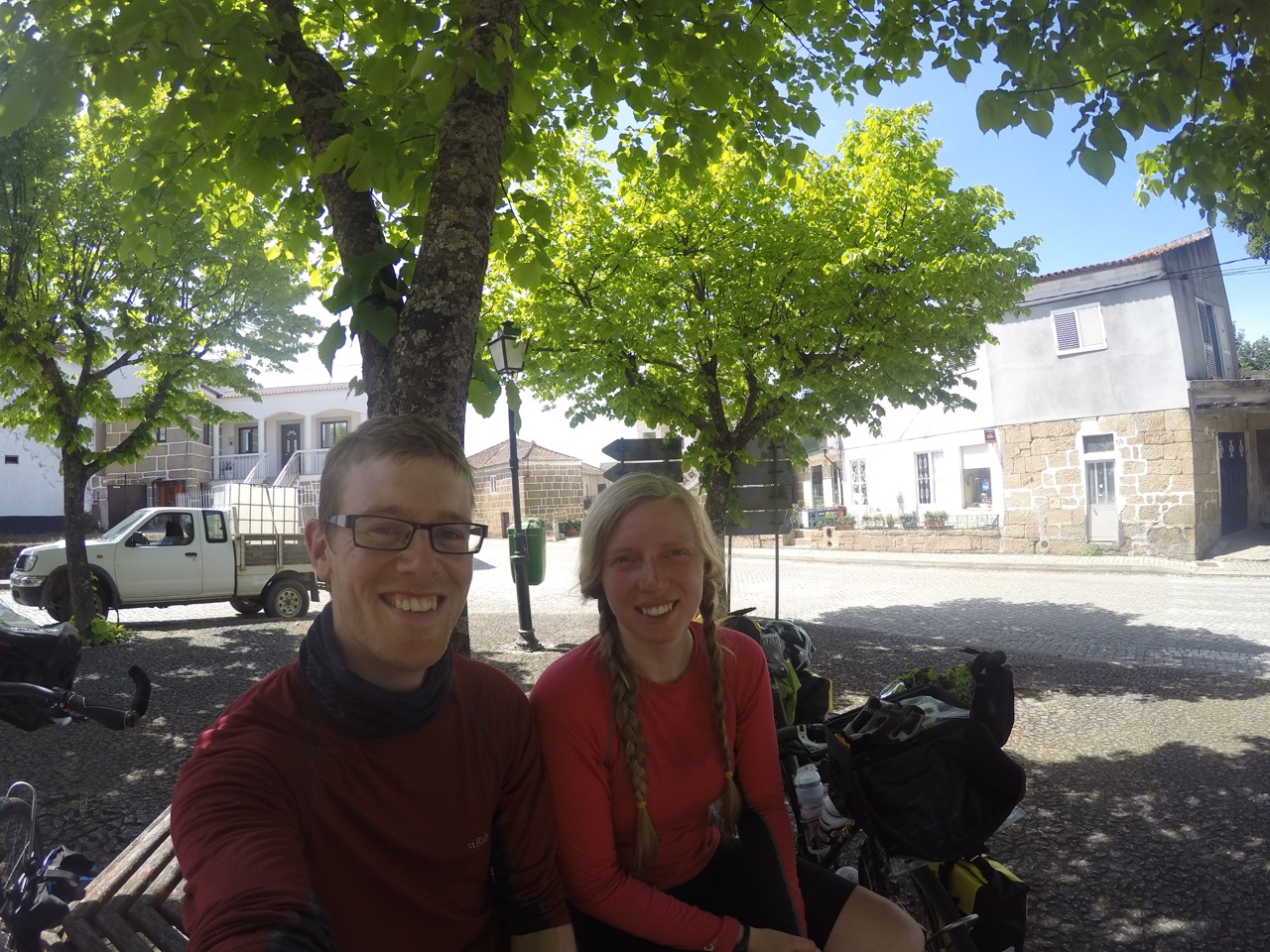 Every town and village here has a stone church and rectangular graveyard and, in this part of Portugal, quite often a few shrines too. The churches almost all have benches and water fountains near them and are usually in the middle of town, near a few shops, so they’re really useful for us and we often stop for one of our lunches by a church and wave at the curious locals. Today, after our big uphill out of town in the heat, we stopped at a church as the 3pm bells were chiming. We stepped off our bikes with shaky legs and ate bread and cheese and Portuguese egg custard tarts to recover.