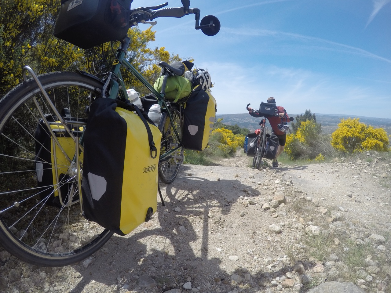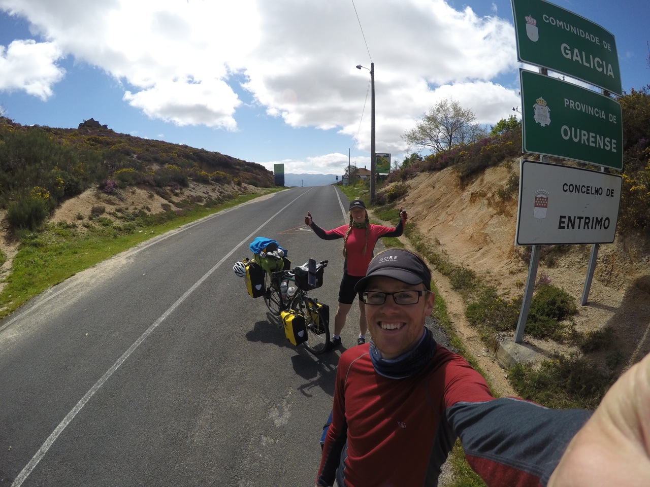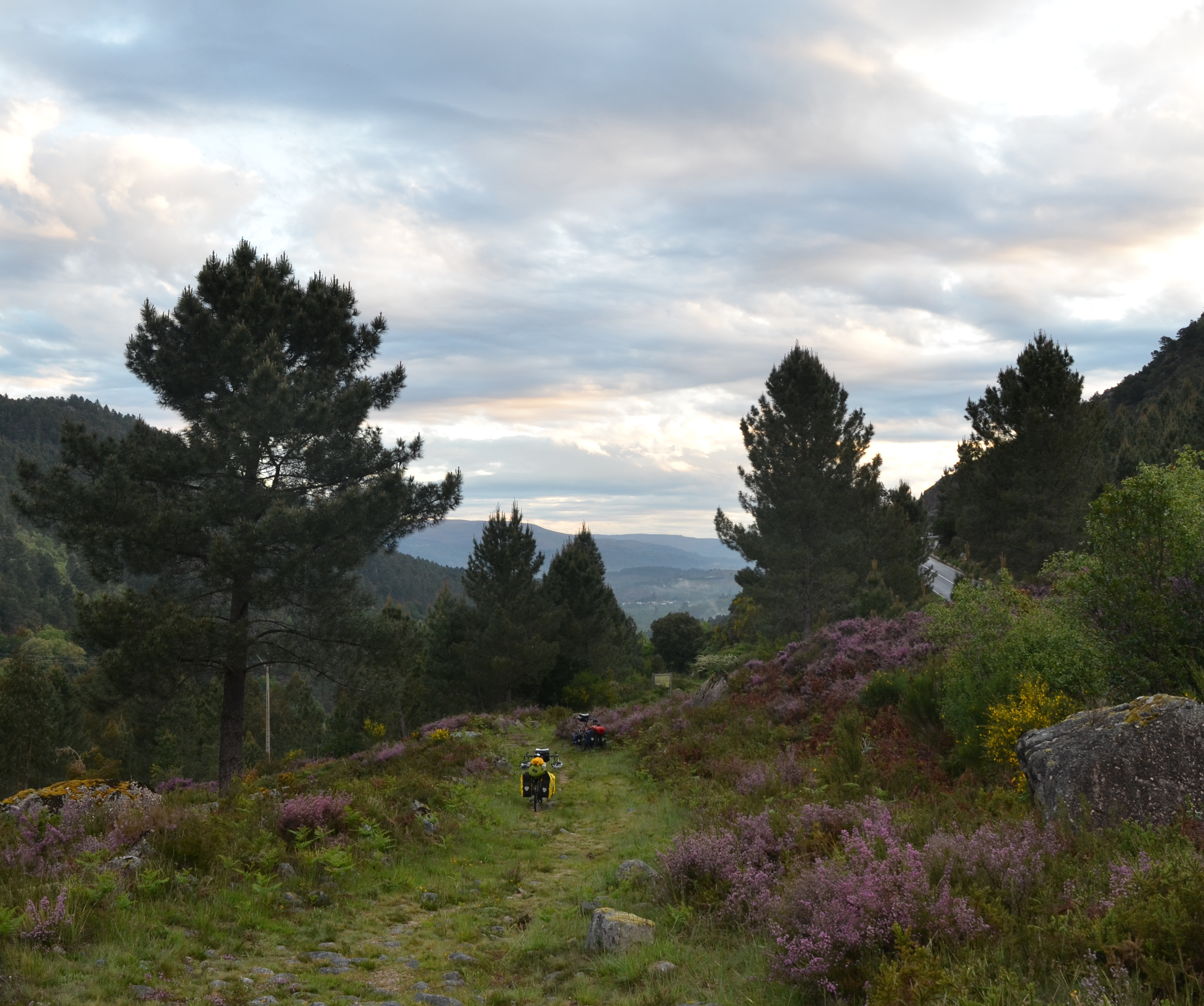 We packed up the wet tent but the weather was decent again, beautiful cloud formations over colourful hills and valleys, the sound of the rivers bubbling in the background and the sun starting to shine on the hilltop above us. At least the clouds meant that we were warm in the morning for a change! We breakfasted at the picnic table just below where we’d camped and started up the pass towards the Portuguese border.