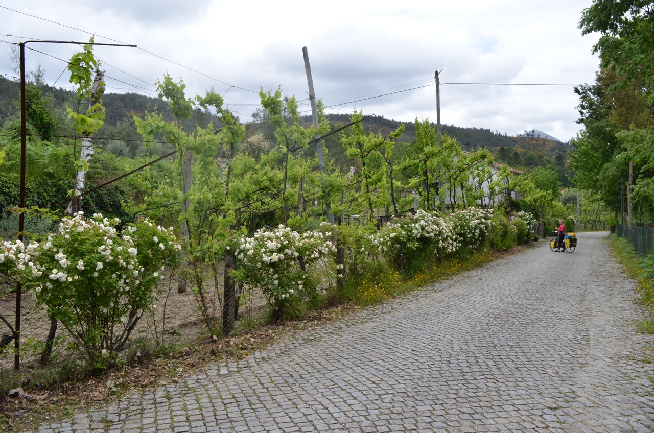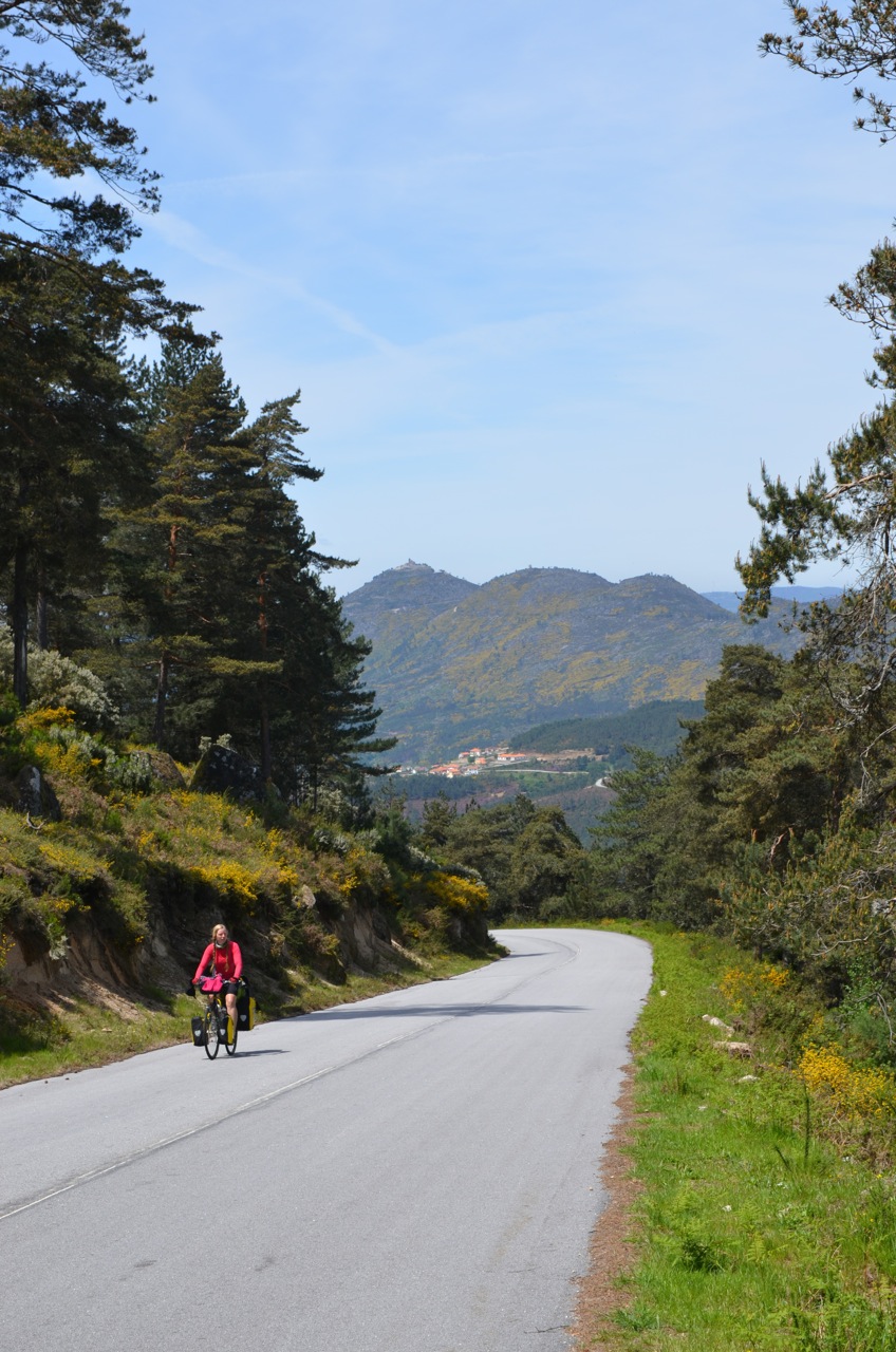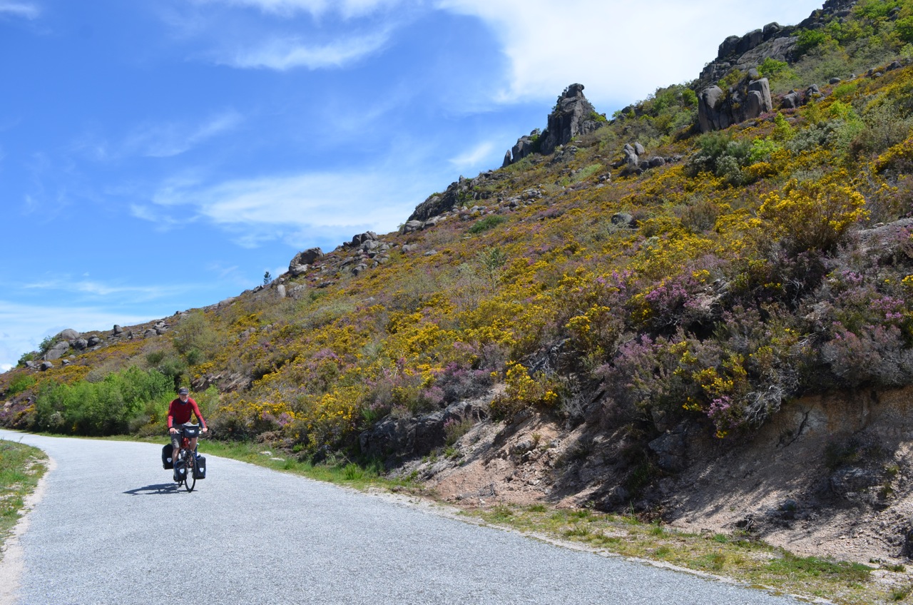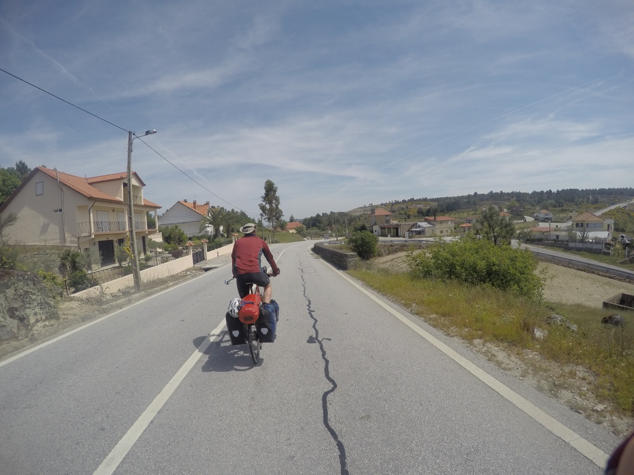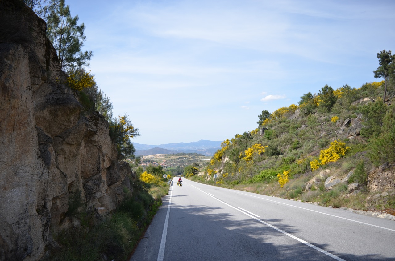 Out of Geres, we had a bit more downhill to do (zoom!) where we exited the national park before reaching the part of the Rio Caldo that is so wide it looks like a big lake. Then we crossed over and headed up out of the valley, more switchbacks surrounded by houses with big vegetable gardens, orange trees and vineyards. We sweated up in the afternoon sun and were sorry for the lack of hard shoulder given the (relatively) heavy traffic. But we made good progress, the views of the valley got better all the way up and it was a beautiful day to be out.