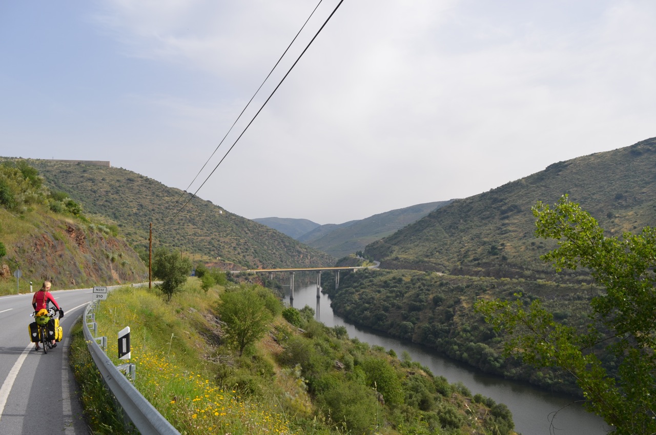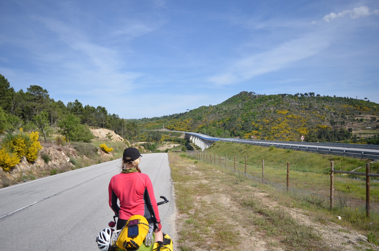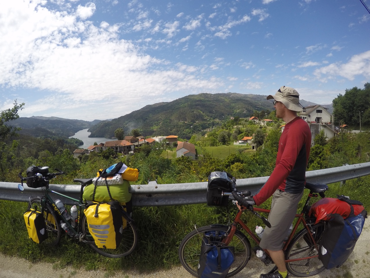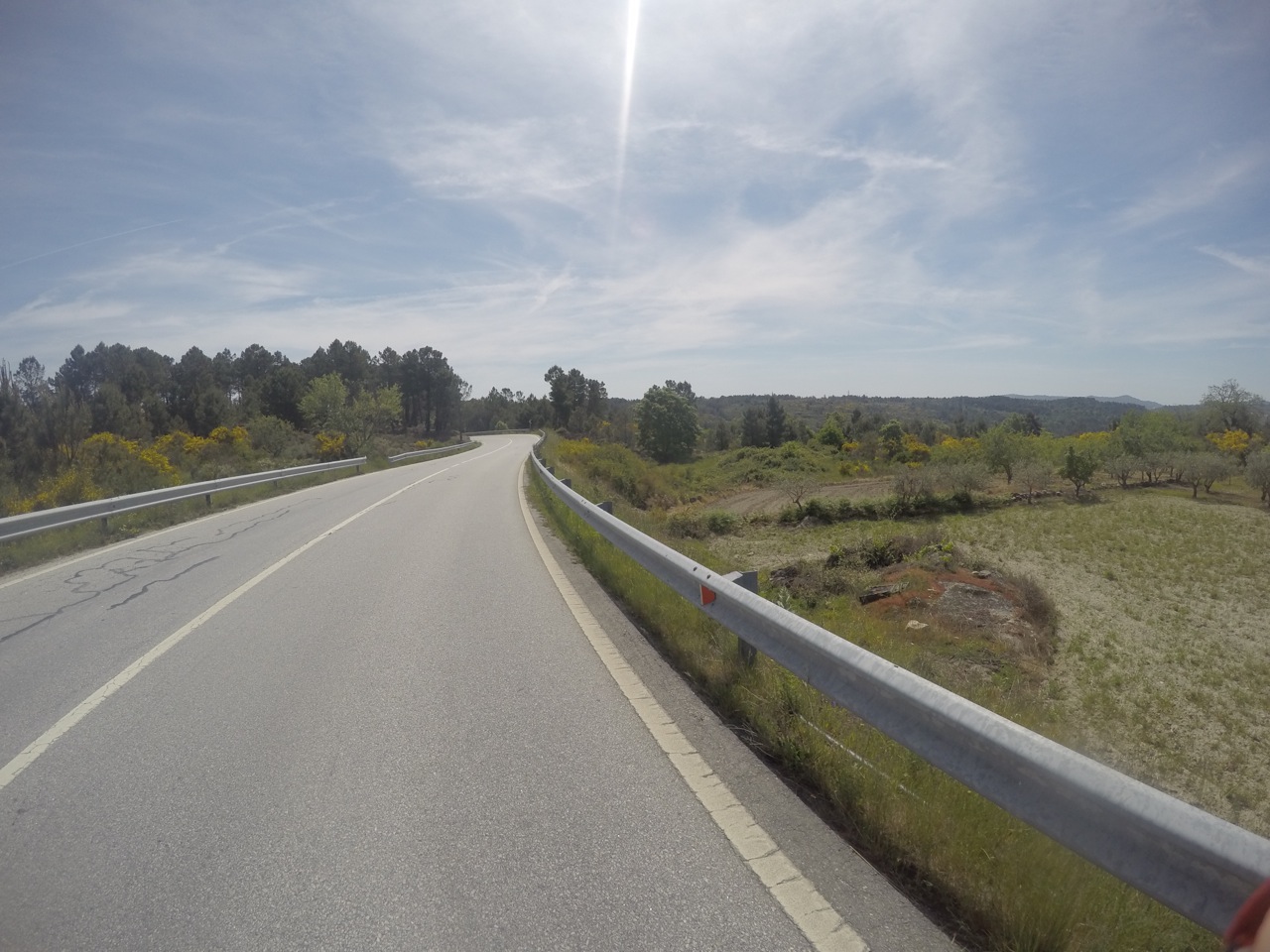 Out of Geres, we had a bit more downhill to do (zoom!) where we exited the national park before reaching the part of the Rio Caldo that is so wide it looks like a big lake. Then we crossed over and headed up out of the valley, more switchbacks surrounded by houses with big vegetable gardens, orange trees and vineyards. We sweated up in the afternoon sun and were sorry for the lack of hard shoulder given the (relatively) heavy traffic. But we made good progress, the views of the valley got better all the way up and it was a beautiful day to be out.