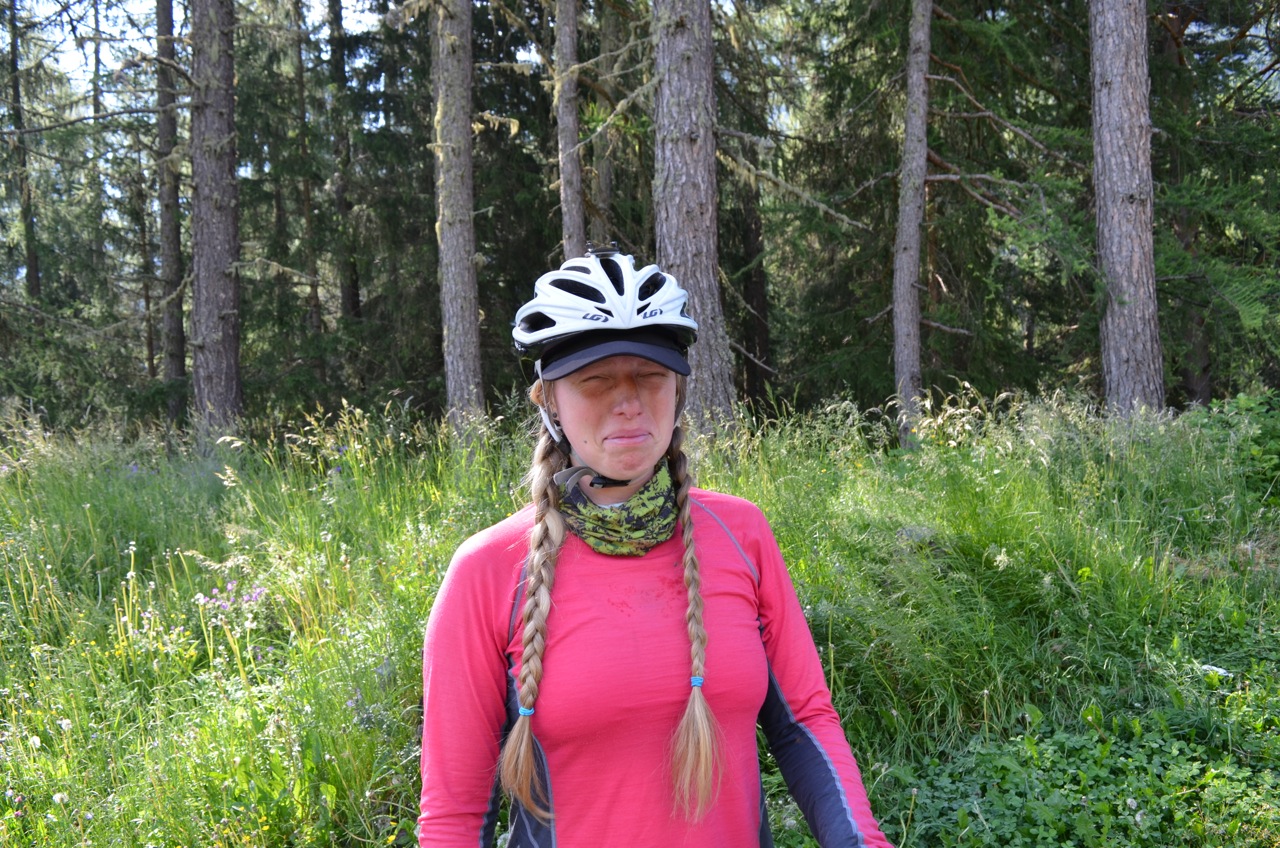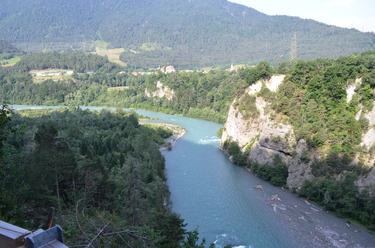 It was getting warmer the lower we went and by now we were pretty toasty! We stopped for water and second suncream applications. Then our uninterrupted downhill section was over and we found ourselves going up a little bit between villages. I was feeling tired and the oppressive heat wasn’t helping. A few more uphill sections later and I asked Dave if we could stop at the next campsite we came across. He agreed (possibly reluctantly) but it was another 5km or so before we saw a sign. We followed it into the village, up a mega steep hill for 500m. It was the smallest campsite I’ve ever seen! And distinctly lacking in shade. Hmm. We had a nice chat with two of the guests who were staying there whilst working on an alp. Then we decided we didn’t want to stay in the miniature shadeless campsite and sped back down the hill to rejoin the main road and go uphill again towards Thusis.