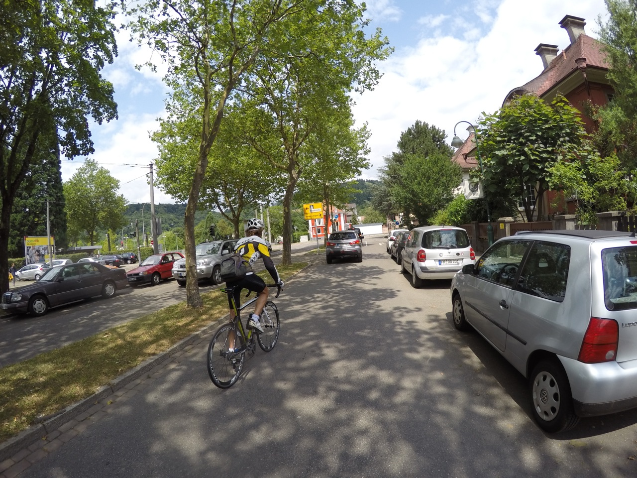 After lunch the road carried on steeply down through larch forests and tourist areas. There was even a railway going alongside us! After a section of roadworks, a big truck tailgaited us before he could overtake precariously, then stop in front of us and make us wait. But some more beautiful scenery and free-wheeling cheered us up again.
