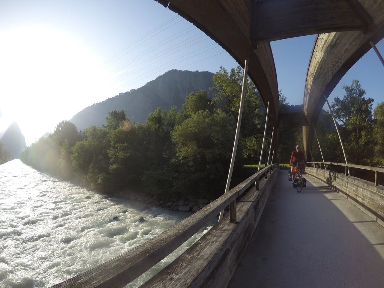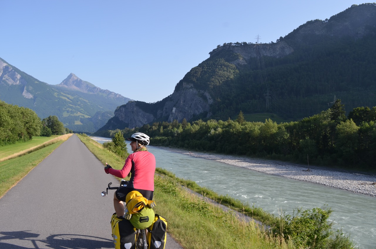 The map told us that 4 more tunnels were coming up and only the last one had an alternative route. So we mounted the lights, had a biscuit and set off down the mountain again. On the whole, it went pretty well. We only got shouted at once for not being on the pavement (which was too narrow for bikes with luggage) and most of the drivers were considerate. The last tunnel was only for cars and we took the quiet side road around it instead, arriving into Thusis tired but triumphant.