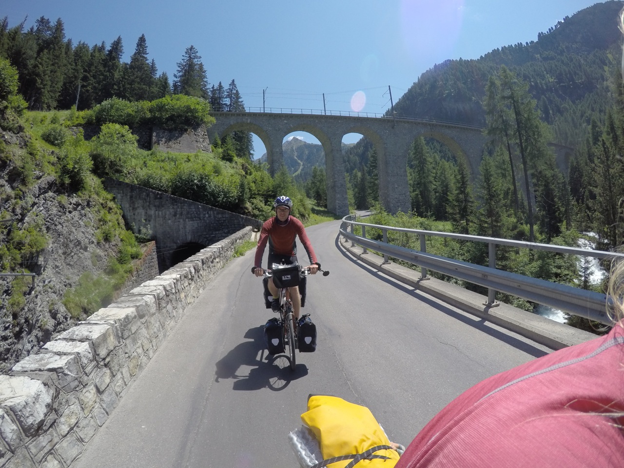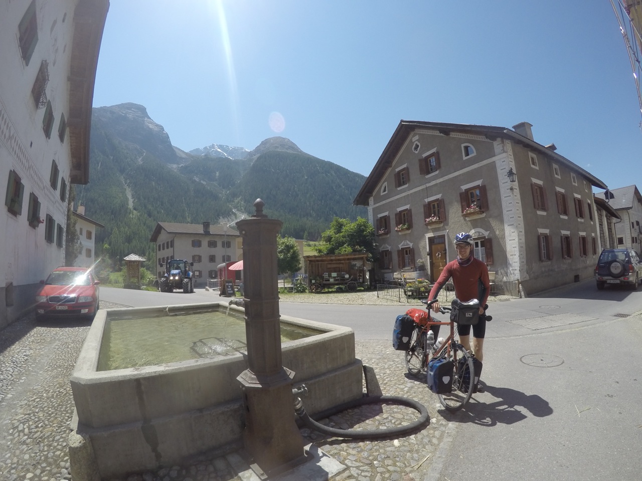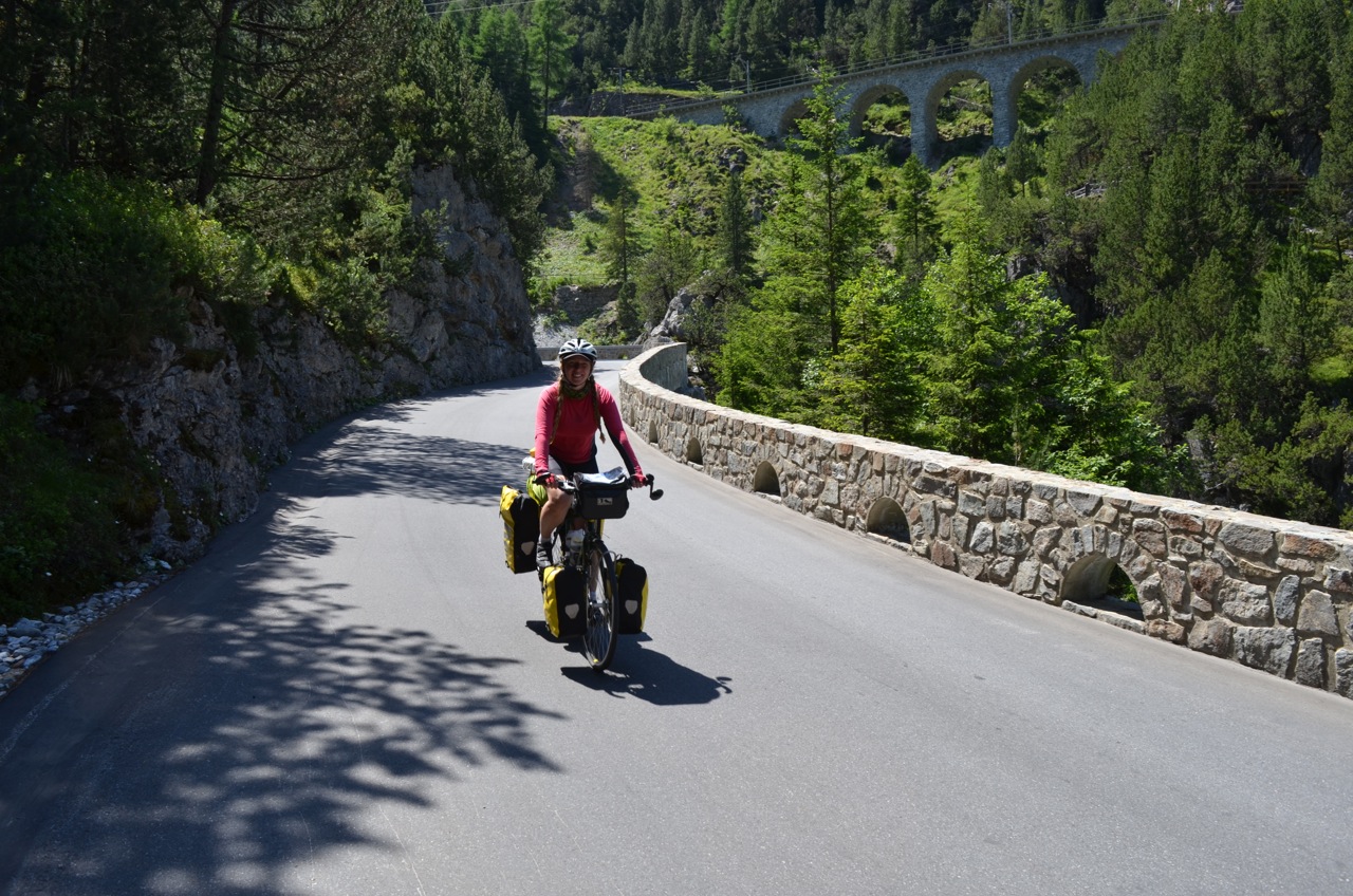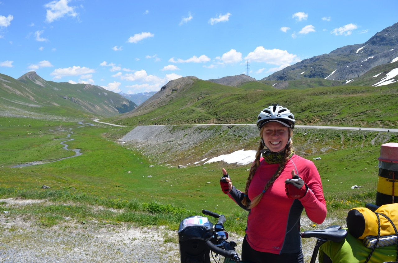 As we set off up the road out of the village, we were greeted by a mountainside with a road wiggling up the front of it. Granny gear engaged, we started tackling the beast. It was breezy down the bottom and we quickly gained height for good views of the valley. The pass was pretty busy with cyclists, a few cars and even some summer cross country skiers, using one-way wheels to ‘ski’ up the hill in the sun!