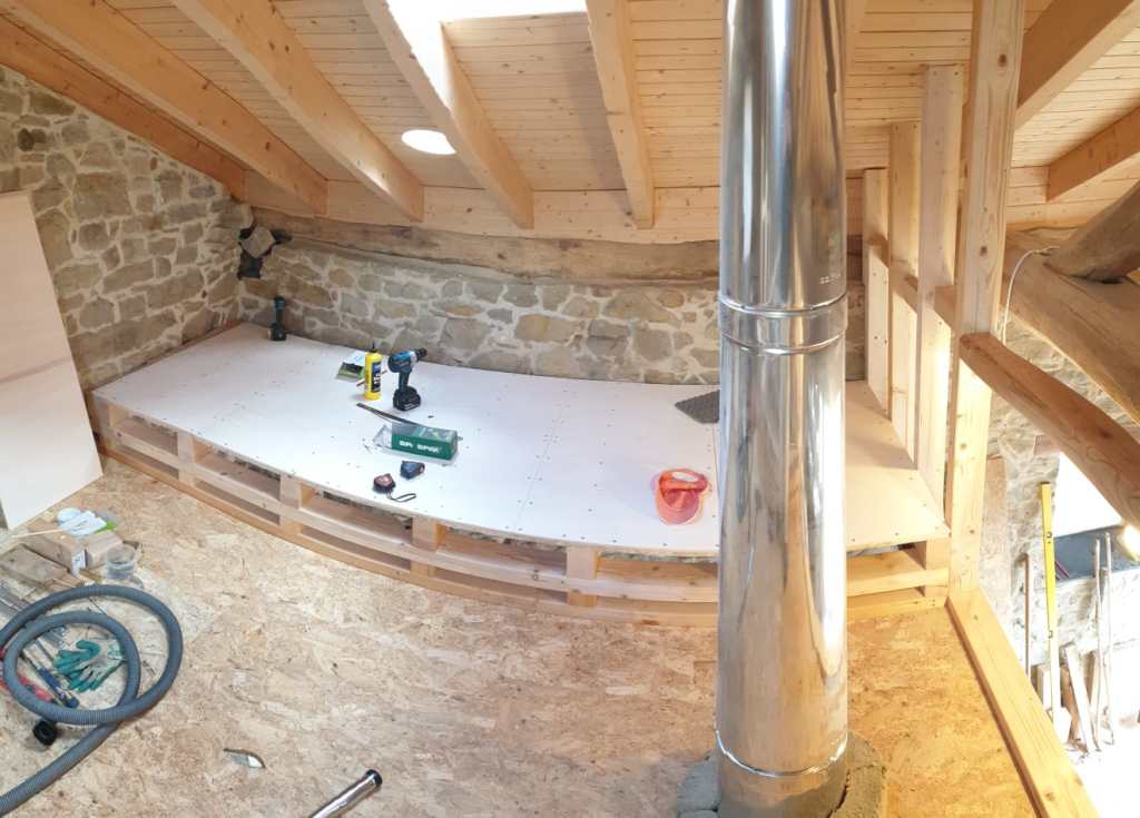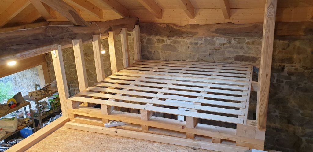 Dave has been busying away on the mezzanine whenever there has been time. We bought some plywood and he cut it into slats and sanded each one all over to make a nice base for our bed. He has also put in the base for the cupboard / wardrobe. We’ve even been talking about wiring for lights, socks and switches in the bedroom too – a whole new world of progress for us!