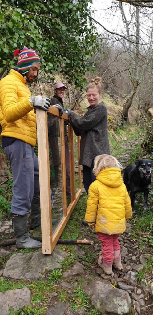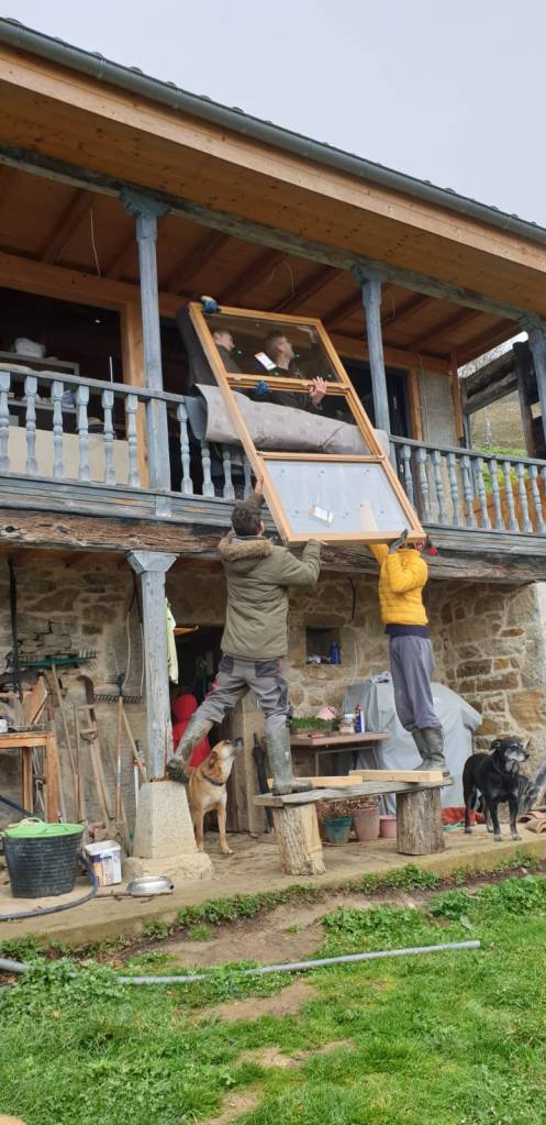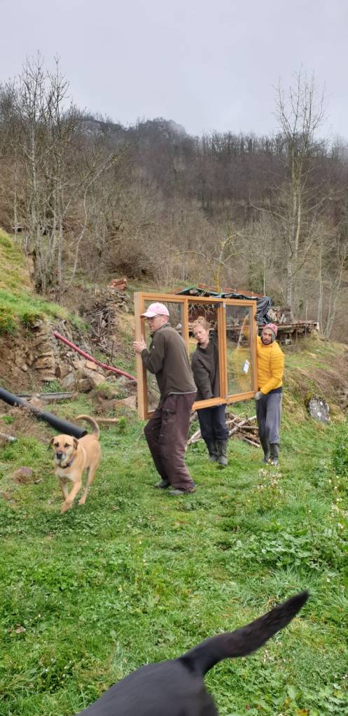 We felt inspired one weekend and bought five local tree varieties – two apples, a plum, a cherry and a walnut. We managed to get them planted by the end of the month, although it was touch and go! And the two windows we had ordered got delivered and we carried them up the hill with the help of some neighbours one Saturday morning.