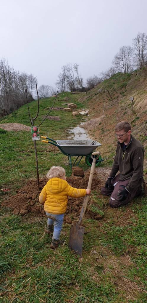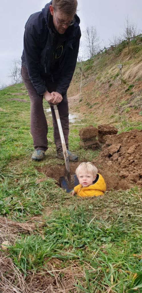 Bouyed by that experience, we have organised a work exchange with some friends who have a three year-old. The idea is that one or two people take the kids, freeing up the others to work. The first one we did at their place, cleaning up the newly refurbished bedroom ready to fit out and use. It worked really well – the kids are so much easier when there are two of them entertaining each other, and it’s nice getting some work done with an impartial helper. At our place, we planted out the last of the little plants from the nursery into the field.